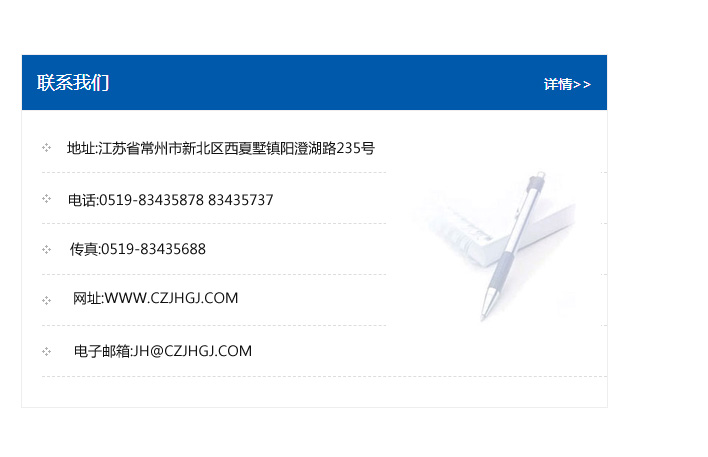 傳真:0519-83435688    郵編:213135    網址:WWW.czjhgj_com.cfjck.com    電子郵箱:JH@czjhgj_com.cfjck.com
